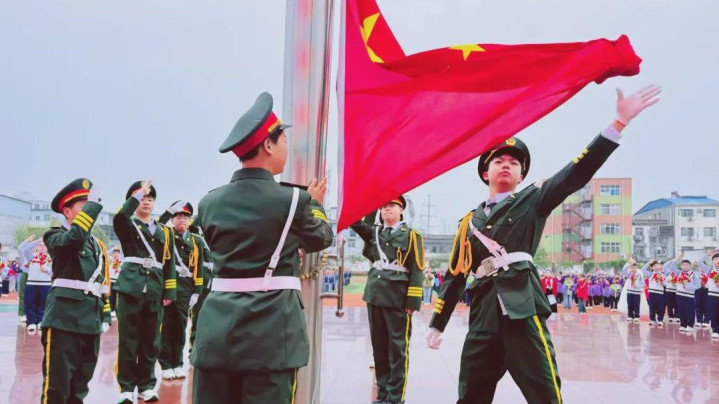伴跟着激越的出旗曲,护旗头们迈着整皆强壮的行径,护送五星红旗走向升旗台。整体师生肃立留神,国歌奏响,五星红旗渐渐腾飞,逆风舒展。