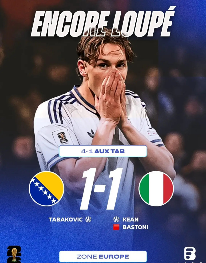 2018年俄罗斯寰宇杯预选赛,意大利在附加赛中被瑞典淘汰,60年来初度无缘寰宇杯。2022年卡塔尔寰宇杯预选赛,意大利又在附加赛中爆冷不敌北马其顿。这一次,换成了波黑。
