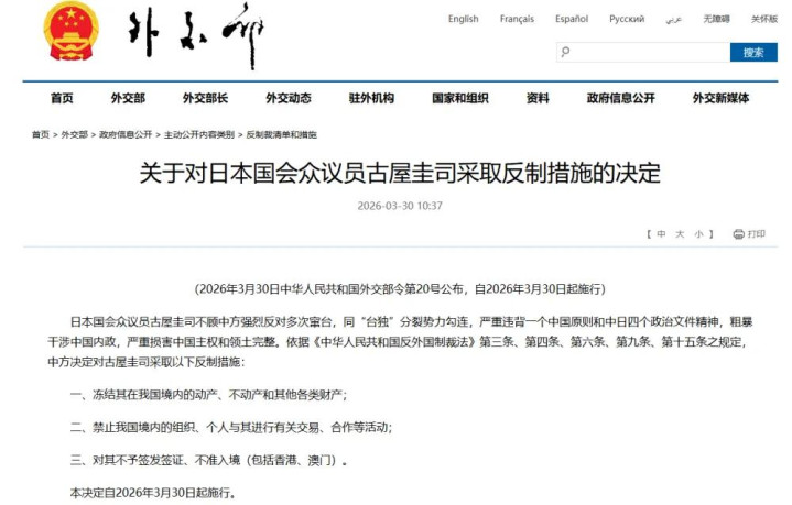 就在导弹部署的前一天,也即是3月30日,中国际交部径直亮剑,依据《反异邦制裁法》对日本政客古屋圭司扩充了严厉的反制。