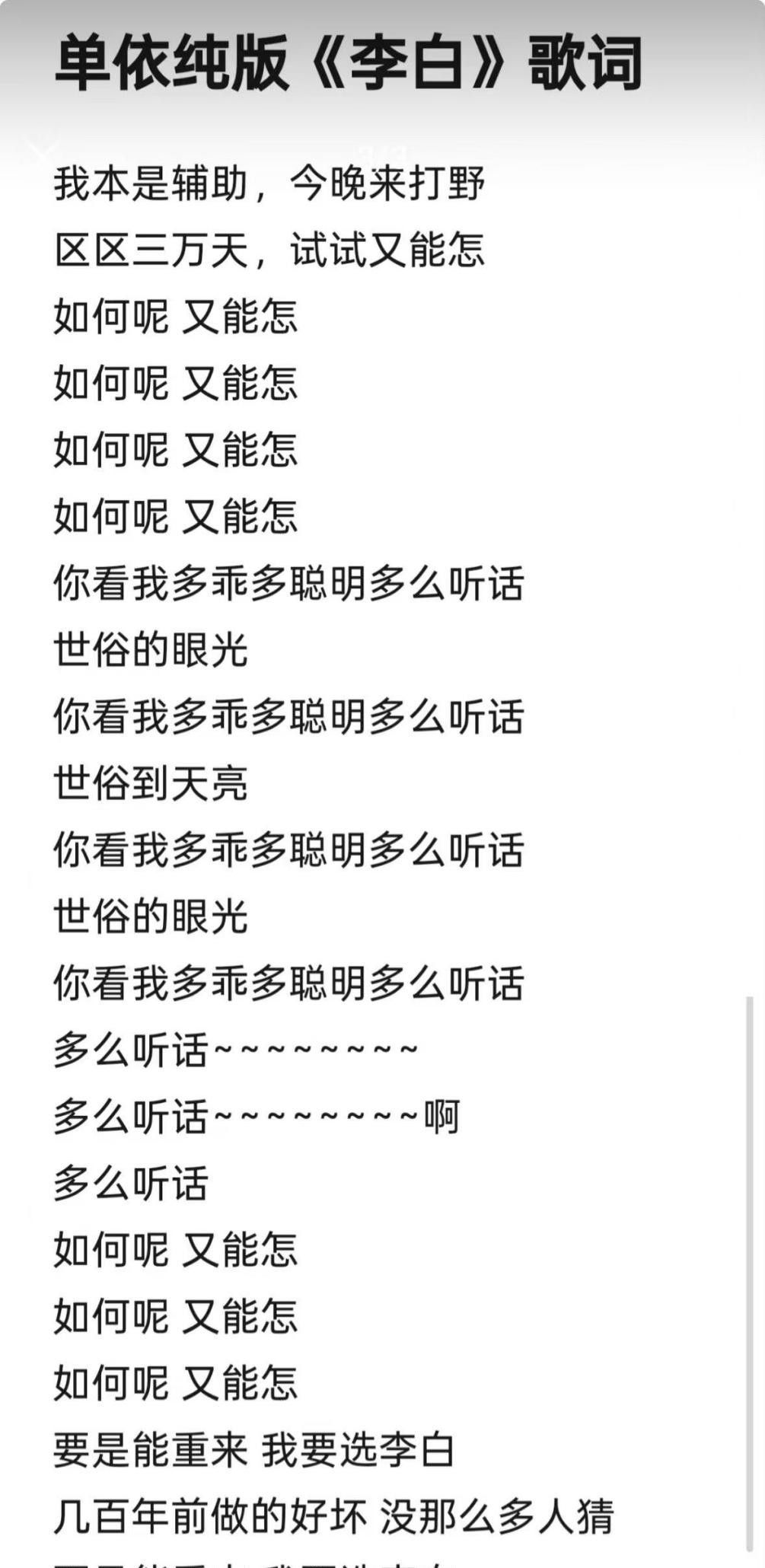 3月28日,单依纯在个东说念主巡回演唱会上随心演绎李荣浩原创歌曲《李白》,且未经受原词原曲,而是大幅改编为“我本是李白,今晚来打野”,副歌部分反复颂扬魔性变嫌的“怎样呢,又能怎”。