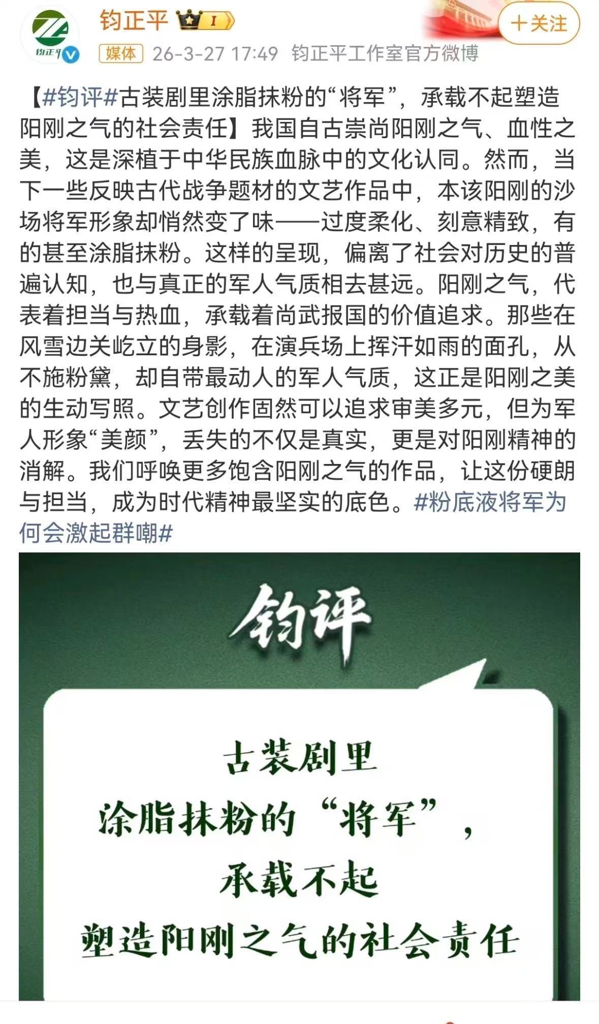 事态捏续升温,目田军新闻传播中心旗下巨擘评述品牌“钧正平”追究发声:“脂粉气油腻的将军形象,难以承载时间赋予文艺职责者的社会包袱。”