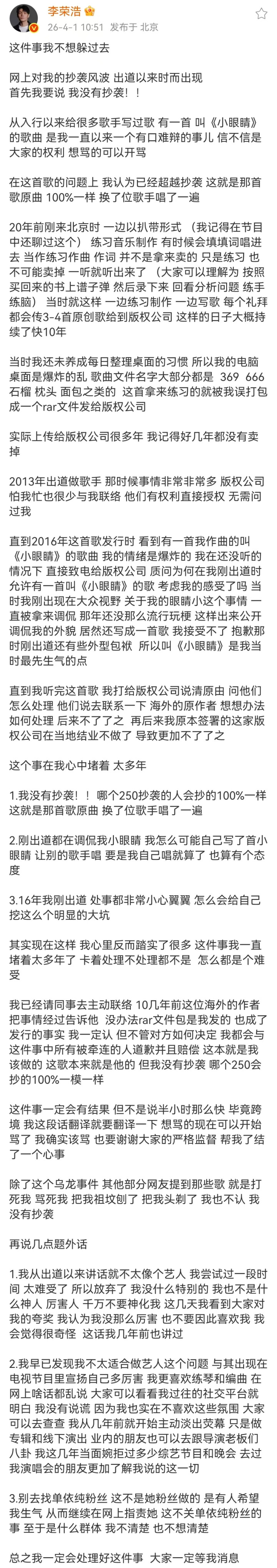 李荣浩还提到,“除了这个乌龙事件,其他部分网友提到那些歌,即是打死我、骂死我、把我祖坟刨了、把我头剃了,我也不认,我莫得抄袭。”