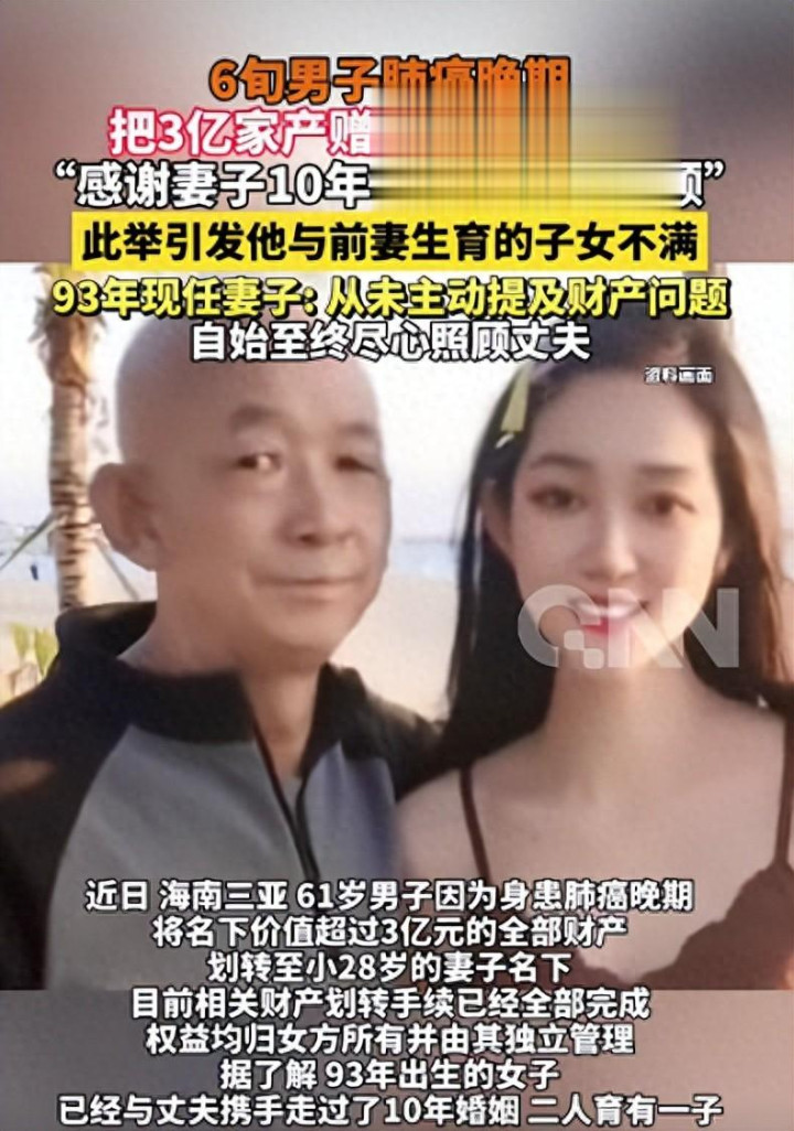 据海报新闻报说念,海南三亚61岁男人患肺癌晚期,赠3亿家产致谢小28岁内助10年相伴,当今,有关财产划转手续仍是一皆完成,职权均归女方扫数,并由其孤立科罚。