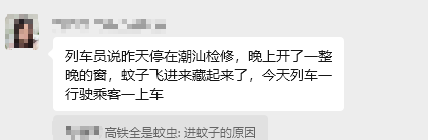 此前据江南齐市报,3月31日,有网友发帖称,G386次列车1至16节车厢,从香港开赴到上海虹桥,车内有许多蚊虫。