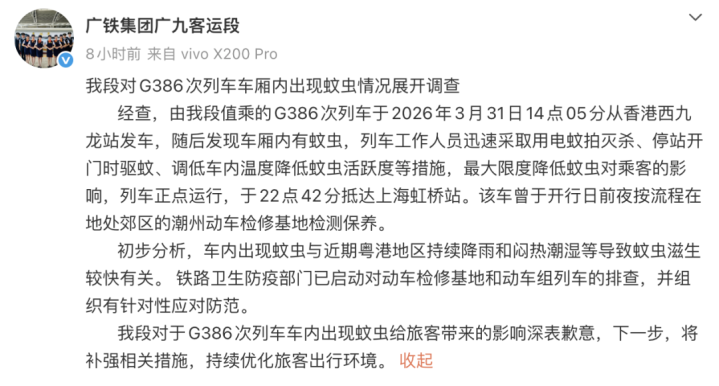 经查,由我段值乘的G386次列车于2026年3月31日14点05分从香港西九龙站发车,随后发现车厢内有蚊虫,列车职责主说念主员连忙选拔用电蚊拍灭杀、停站开门时驱蚊、调低车内温度裁汰蚊虫活跃度等步伐,最大甘休裁汰蚊虫对乘客的影响,列车正点开动,于22点42分抵达上海虹桥站。该车曾于开行日前夕按经由在地处郊区的潮州动车测验基地检测崇尚。