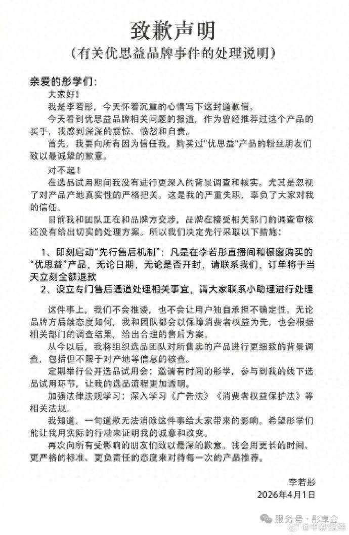 近日,“优想益”产物因被央视曝光假澳洲入口已全网下架,多位明星、主播曾带货相干产物。4月1日,据中新经纬,李若彤直播间官微“彤享会”发布致歉声明,“李若彤专属小助理”随后也在一又友圈发布该声明。该声明称:在选品试用时代我莫得进行更深刻的配景窥探和核实。尤其是淡薄了对产物产地确切性的严格把关。这是我的严重渎职,亏负了群众对我的信任。