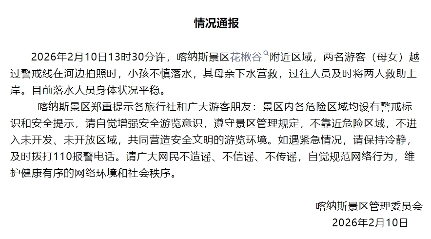 2月10日晚,据新疆喀纳斯景区惩处委员和会报,2月10日13时30分许,喀纳斯景区花楸谷隔壁区域,两名旅客(母女)跳跃警戒线在河畔拍照时,小孩失慎落水,滚球app(中国)其母亲下水赠给,过往东谈主员实时将两东谈主补救上岸。当今落水东谈主员躯壳现象牢固。