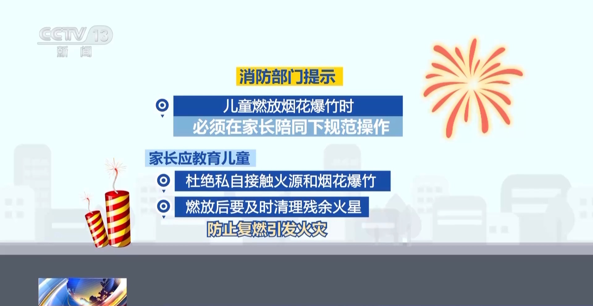 消防部门辅导,儿童燃放烟花炮竹时,必须在家长随同下轨范操作。家长应教化儿童阻绝暗自讲和火源和烟花炮竹,燃放后要实时计帐残余火星,防护复燃激勉失火。