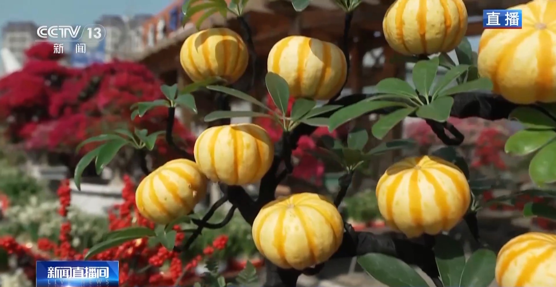 此外,这里还有一些很有创意的花草,比如这盆“金瓜”。在闽南语里,南瓜被称为“金瓜”,寓意着新的一年生计“顶呱呱”;还有三角梅,通过嫁接本事,一株能开出好几种热枕,呈现出“万紫千红”的风物;以及挂满红果子、喜庆澈底的小冬青,也齐是市集的亮点。