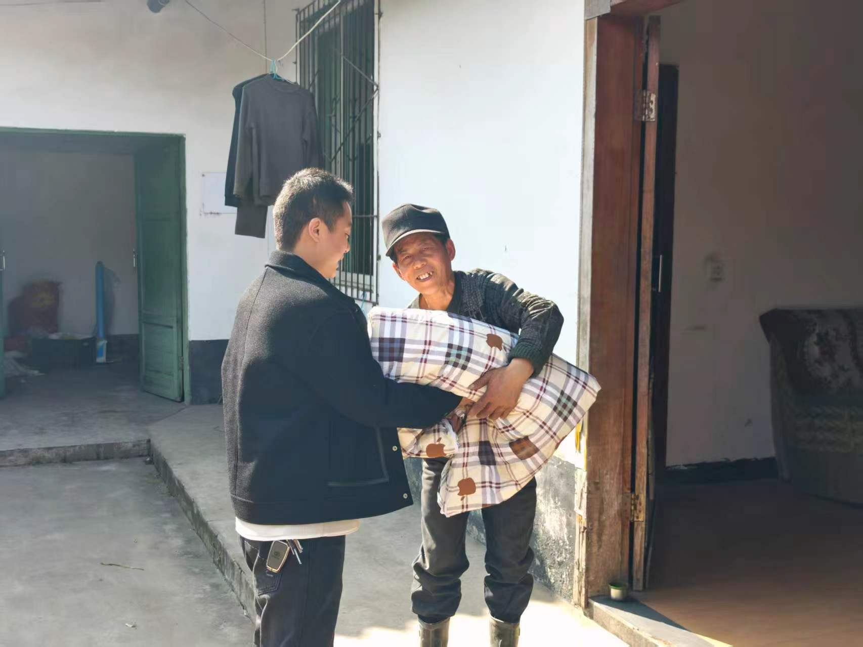 广元市旺苍县济急处治局责任主谈主员将新鲜的棉被、棉大衣送到20户重心维持对象手中。