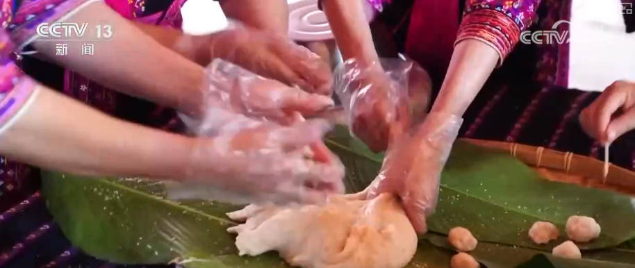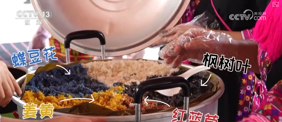 使命主说念主员盘昕先容,五色饭便是由4种不同植物染制而成的,吃起来有点甘甜,浅浅的甜味。寓意着五谷丰登、团圆十足。