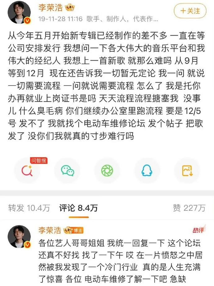 他还真不是针对谁,无论对面是个东谈主是公司如故老本,他一直都是如斯爱维权。往日平台拖着不给他发新专辑,他就平直发微博点名,再不给他发歌,他就找个电动车维修论坛把歌发了。