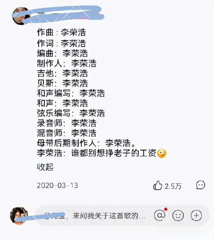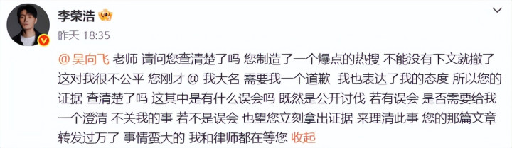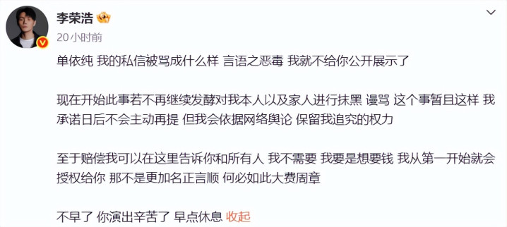 李荣浩:我私信被骂成啥样就不给你展示了,这事儿若是能到此为止,不再骂我我就不会再主动提,但我会根据蚁合公论,保留追究的权力。我也不需要抵偿,若是图钱的话早就授权给你了,还费这功夫干啥?