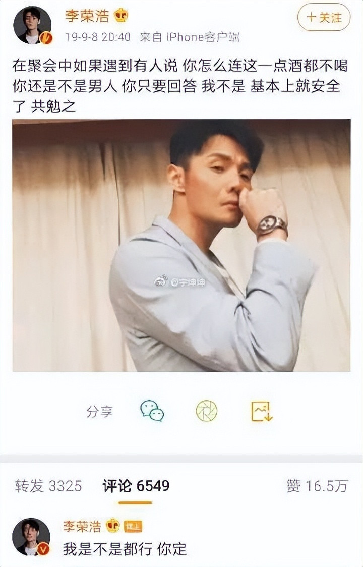 在约会上被劝酒,他反手就发微博建议小建议,东谈主家说他“你如故不是男东谈主”,唯有回答“我不是”就安全了,共勉完还要在考虑区补充一句,“我是不是都行,你定”。
