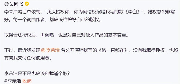 侵权事实过于显然,李荣浩发起驳诘四连,“求教你用什么态度、什么权益、什么角度、什么心态演唱”?