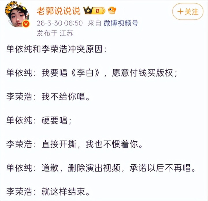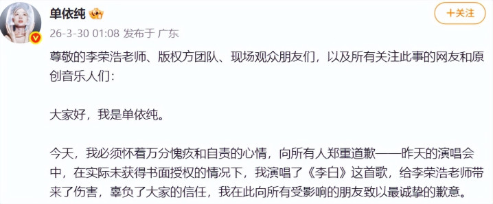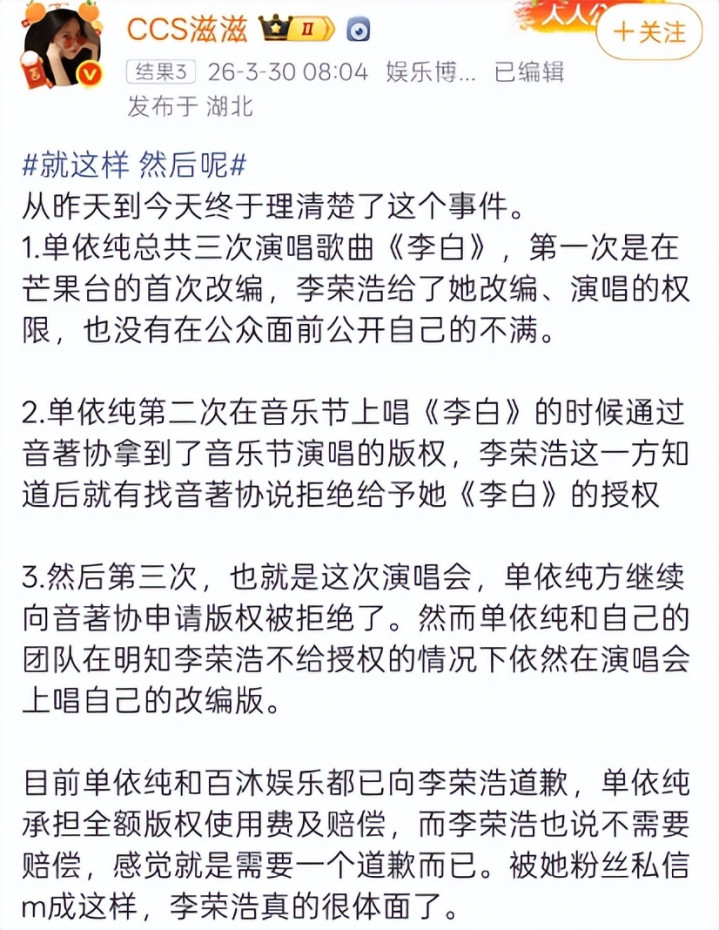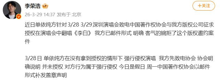 先给没吃上这口瓜的一又友们简便讲讲发生了什么。3月29日,李荣浩发布长文喊话单依纯,说她在深圳演唱会上翻唱《李白》,是在莫得拿到授权的情形下强行侵权演唱。