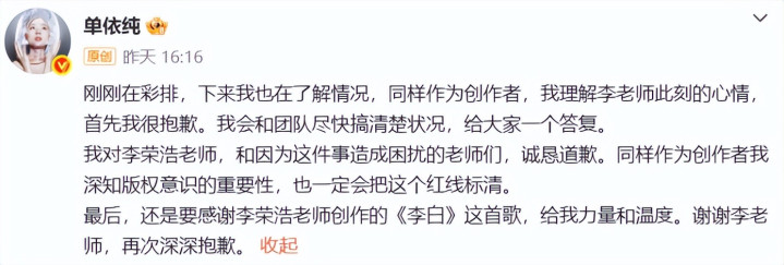 目下的最新进展是,单依纯隔天就谈歉了,而且这份谈歉看起来也蛮有忠诚。她上来就承认侵权是事实,而且会坐窝住手侵权行动,指后续不再翻唱《李白》、删除联系物料、关闭官方传播通谈等。
