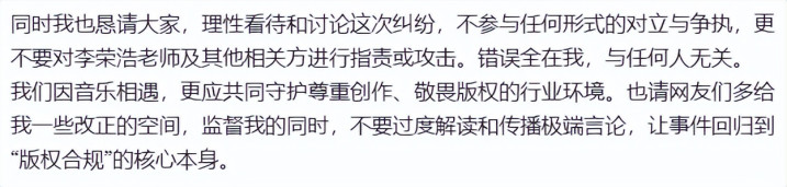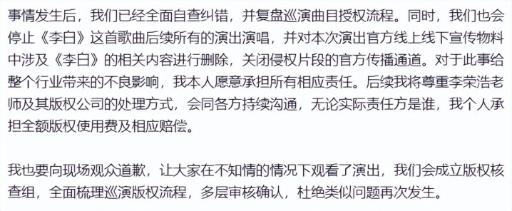 她倒了一圈歉,还示意我方无礼承担悉数相应牵累,后续将尊重李荣浩偏激版权公司的料理格式,无论执行牵累方是谁,她个东谈主都会承担全额版权使用费及相应抵偿。