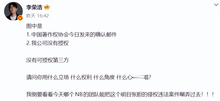 如故说回李荣浩,他网速是真的快,单依纯这边刚发完微博,他秒跟一条回复,放上中国著述权协会发来的阐明邮件,明确协会并未授权,他公司也未授权,而且不存在可授权的第三方。