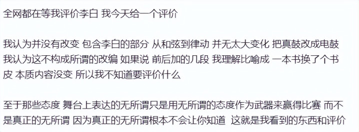 他还给单依纯版的《李白》补充了评价,那即是不知谈要评价什么,因为在他看来,所谓改编仅仅“把一册书换个书皮,实质内容没变”,而她在舞台上的无所谓,仅仅用来取得比赛的器用,并不是真的无所谓。