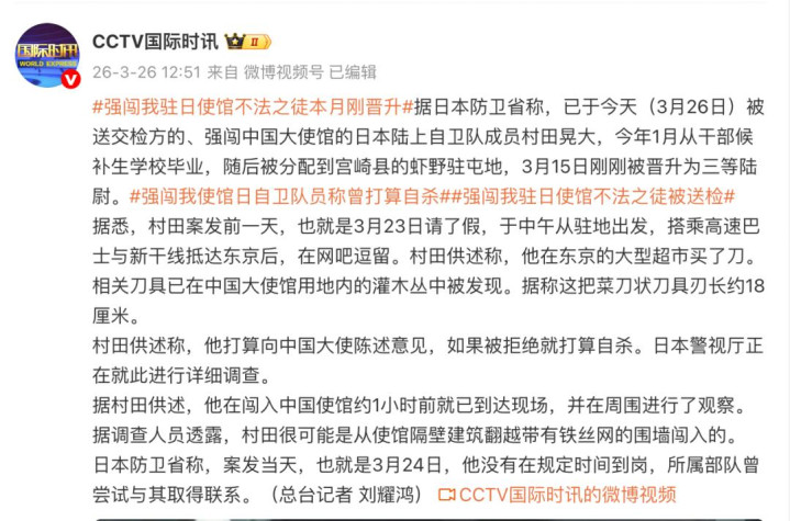 3月24日,别称日本陆上自保队现役军官翻墙干与中国驻日本大使馆,身上佩带有刃长为18厘米的刀具,况兼扬言要杀死中海酬酢官。