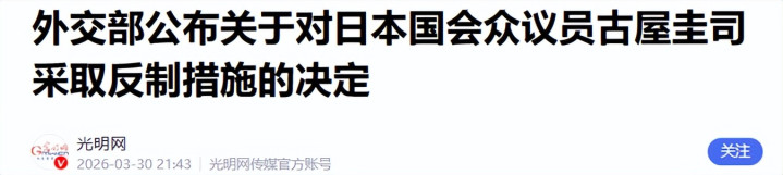 1.《酬酢部公布对于对日本国会众议员古屋圭司经受反制圭表的决定》2026-03-30 21:43 | 起原:光明网