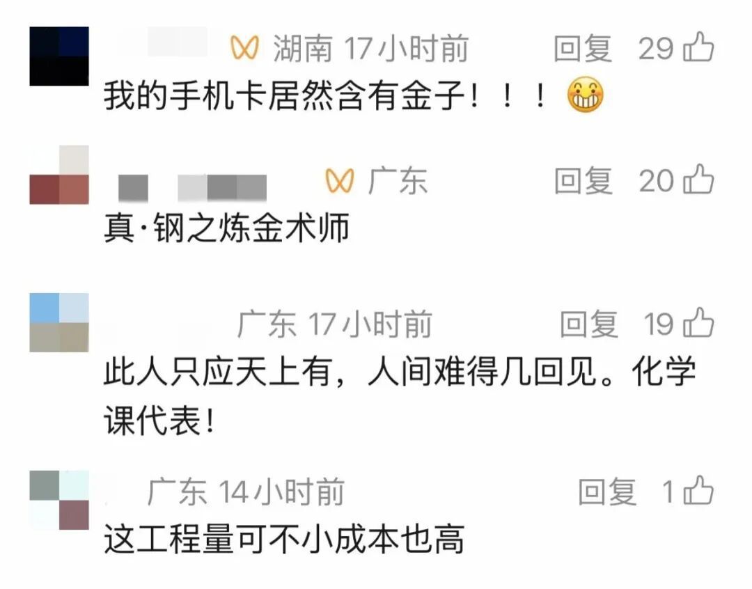1月20日,广东一须眉用170多公斤的手机SIM卡芯片废物,经过一系列复杂工序后,得胜真金不怕火出191.73克黄金。按照最新的黄金价钱 1120.00元/克推断,总价值 214737.6元。
