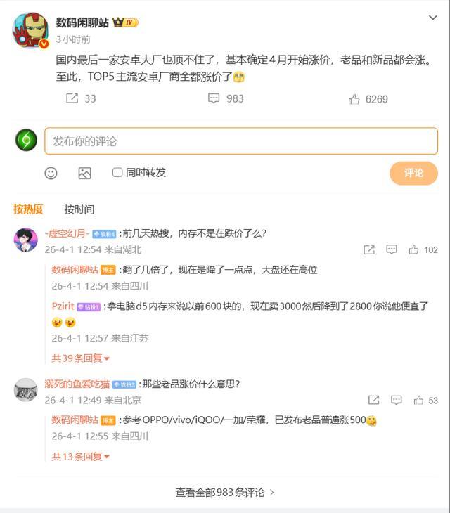 4月1日音信,据博主 数码闲聊站 知道,称国内终末一家安卓大厂也顶不住了,基本细则 4 月运转加价,老品和新品都会涨。至此,TOP5 主流安卓厂商皆备加价。
