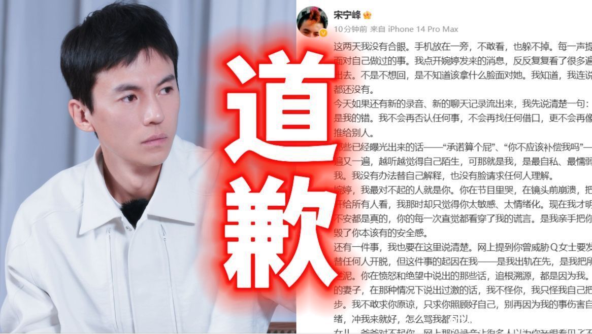风浪发酵后,宋宁峰于4月1日凌晨发布千字致歉长文,坦承造反行径,分解自己自利骨子与本性软肋。