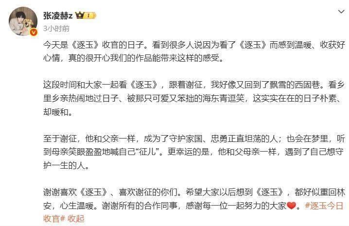 3月30日《逐玉》收官当日,演员张凌赫发布手写长告示别变装“谢征”。