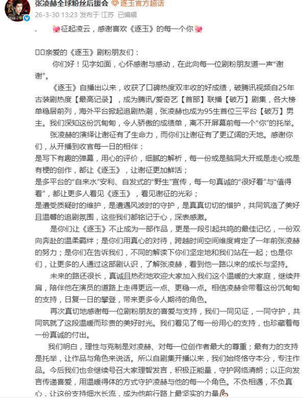 群众粉丝后盾会同步发布长信,感谢剧粉对《逐玉》的托举,强调“张凌赫的演绎让谢征有了人命力,而你们让谢征有了更豁达的全国”。